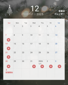 年末年始の営業につきまして、下記の通りご案内いたします。